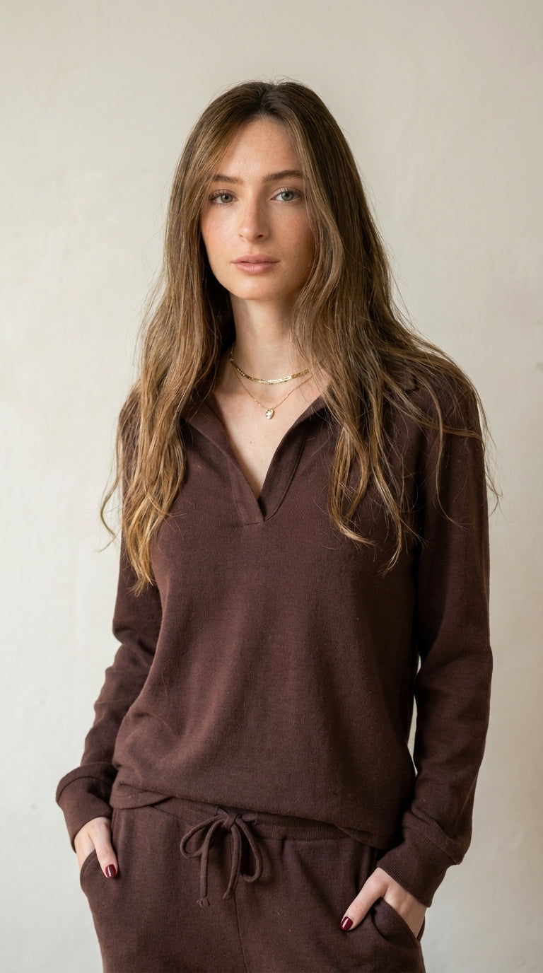 חולצת הנקה עם רוכסנים משני הצדדים סריג פולו| חליפת ״אלה״ | חום -שוקולד